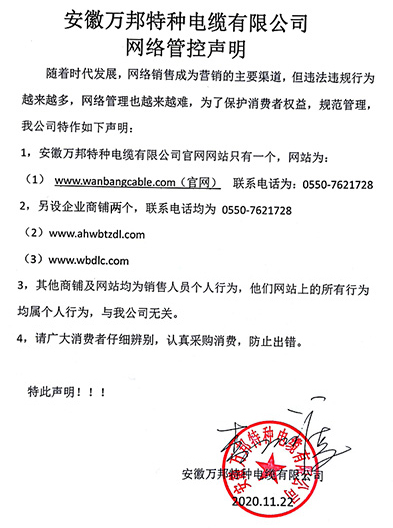 鄭重聲明:安徽萬邦特種電纜有限公司官方網站為:www_wanbangcable_com.6b91.com,除此之外無任何子網站或合作網站,其余均為假冒偽劣。電話:0550-7621728 13485756353 地 址:安徽省天長市滁州高新技術產業開發區經四路29號